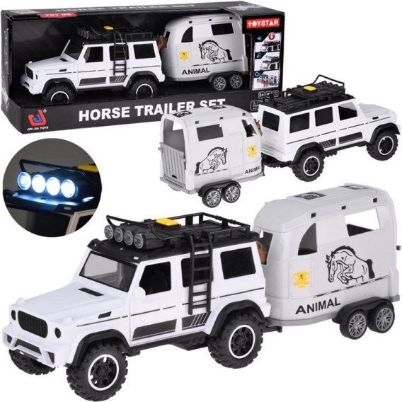 To propozycja dla dzieci, które uwielbiają zarówno pojazdy, jak i przewożenie swoich przeróżnych zabawek! Tym razem w zestawie znajduje się interaktywne, auto terenowe w białym kolorze z czarnymi akcentami oraz jasna, odpinana przyczepka typu bukmanka. Ten typ przyczepy dedykowany jest bezpiecznemu przewozowi koni - jednak nie zmienia to faktu, że dziecko może wsadzić do niej, co tylko będzie chciało przewieźć!