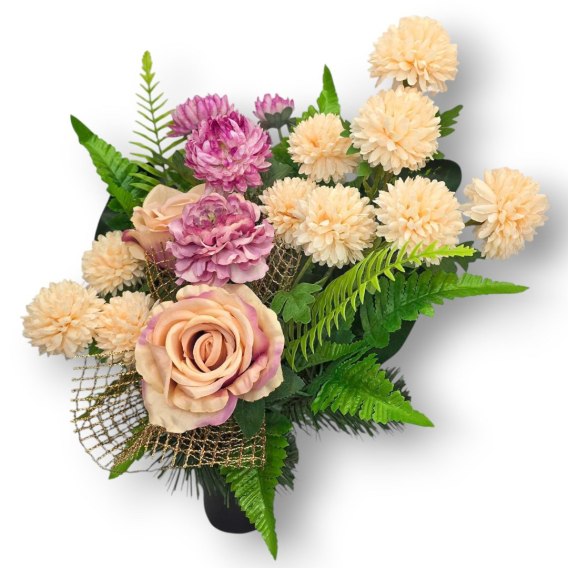 Kompozycje nagrobne z obciążeniem z wysokiej jakości sztucznych kwiatów i roślin.