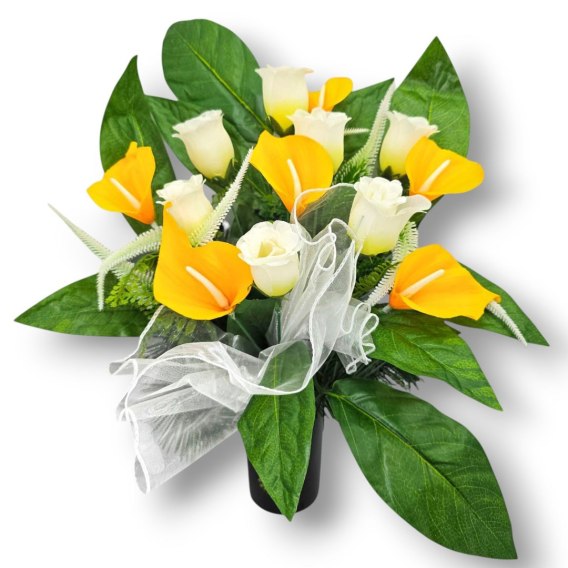 Kompozycje nagrobne z obciążeniem z wysokiej jakości sztucznych kwiatów i roślin.