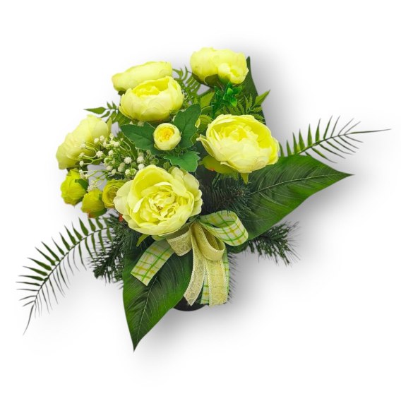 Kompozycje nagrobne z obciążeniem z wysokiej jakości sztucznych kwiatów i roślin.