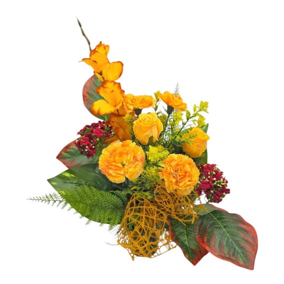 Stroik cechuje się unikalną kompozycją sztucznych kwiatów. Starannie dobrane kwiaty są niezwykle realistyczne, dodając wiązance autentyczności i podkreślając jej uroczysty charakter.