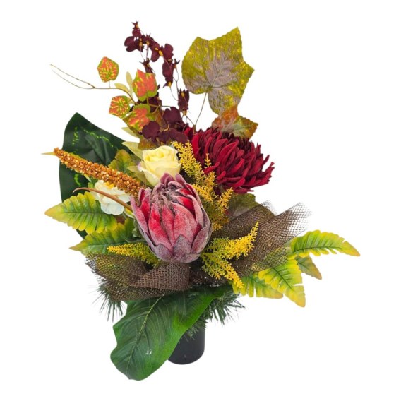 Stroik cechuje się unikalną kompozycją sztucznych kwiatów. Starannie dobrane kwiaty są niezwykle realistyczne, dodając wiązance autentyczności i podkreślając jej uroczysty charakter.