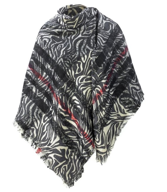 Ciepły szal szalik chusta, to niebanalny element garderoby, zdobią ją etniczne wzory dzikich zwierząt. Dwustronna, a całość ożywiona jest kolorowymi, kontrastowymi paskami. Jest wykonana z miłego w dotyku materiału, który przyjemnie otula ciepłem. Chusta stanowi niebanalne wykończenie każdej stylizacji i jest idealnym wyborem na chłodniejsze dni. Można ją nosić na wiele sposobów, od związania na szyi, po zawinięcie wokół ramion czy też jako apaszka.