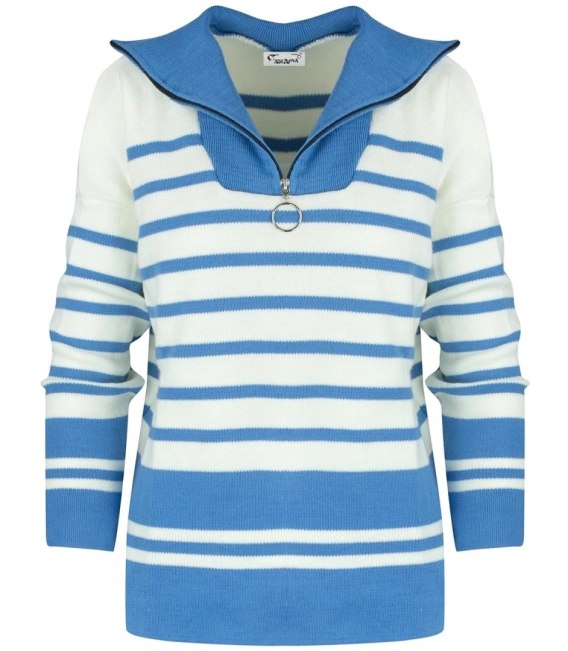 Długi ciepły sweter paski rozpinany IZA (Biały || Niebieski)
