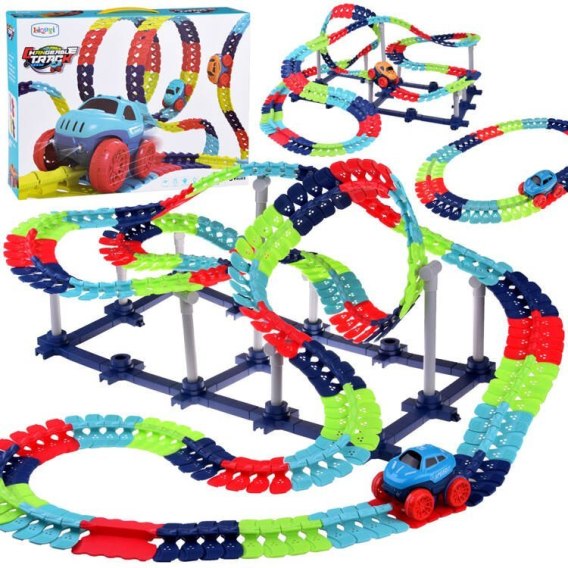 Zestaw zawiera aż 291 elementów pozwalających na zbudowanie trasy o maksymalnej długości aż 580 cm. Trasę można zbudować według własnego pomysłu lub wspomagając się dołączoną instrukcją obrazkową. Można tworzyć krótkie szalone trasy lub duże imponujące konstrukcje rodem z parków rozrywki. Dzięki nietypowemu kształtowi łączników, tor można dowolnie skręcać, zmieniać i tworzyć szalone zakręty.