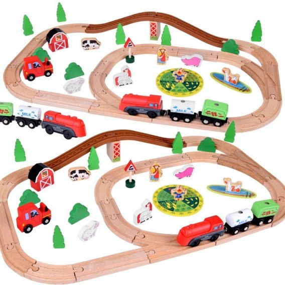 Zestaw składa się z 50 elementów, z których można złożyć tory dla pociągu z wagonami. Zestaw wykonany z wysokiej jakości drewna w atrakcyjnych kolorach i wzorach. Drewniane zabawki zostały pokryte bezpieczną farbą, tory są w naturalnym kolorze. Elementy toru są drewniane z wyjątkiem wiaduktu, który wykonany jest z tworzywa sztucznego. Lokomotywa na baterie (zasilana baterią 1,5 V AAA- brak w zestawie) płynnie porusza się po torach, w trakcie jazdy świeci świtałem, dostarczając niezapomnianych wrażeń i rozwijając wyobraźnię dziecka.