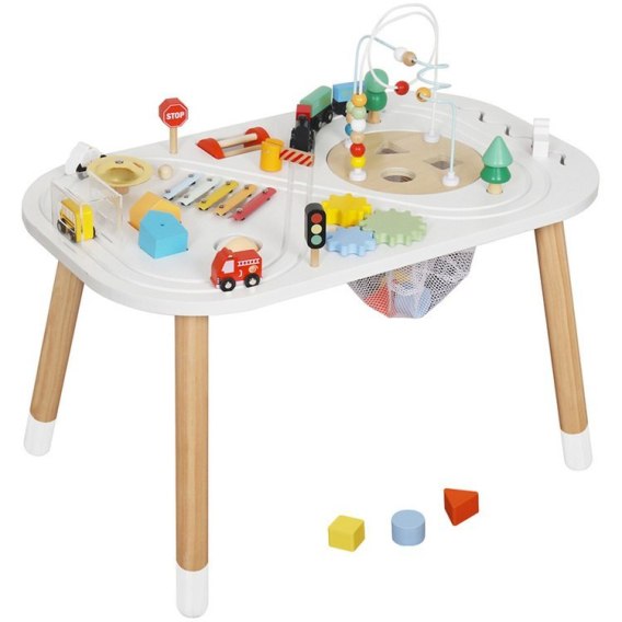 - Multifunkcyjność: Stolik zawiera cymbałki, tor samochodowy, ruchome elementy, znaki drogowe i wiele innych edukacyjnych zabawek.