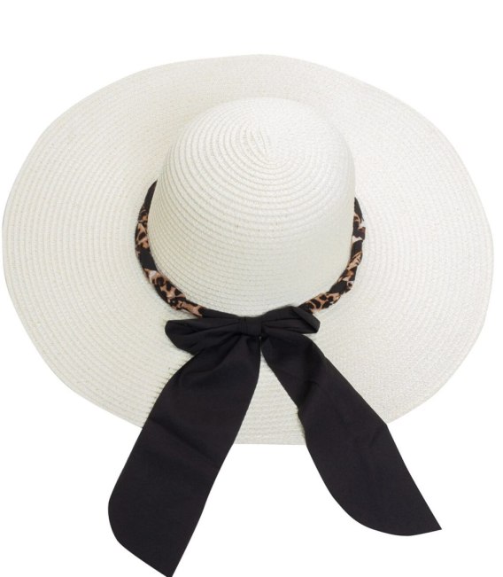 • Modny duży pleciony kapelusz z kokardą i wstążką w panterkę (Ecru)