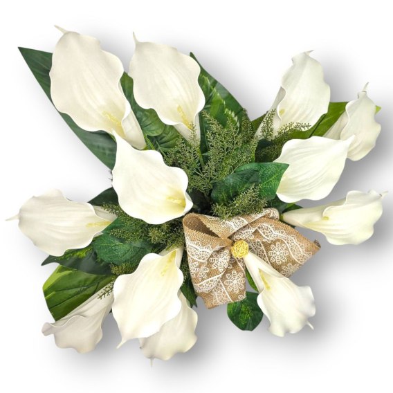 Stroik cechuje się unikalną kompozycją sztucznych kwiatów oraz innych dodatków. Starannie dobrane kwiaty są niezwykle realistyczne i naturalne, dodając wiązance autentyczności i podkreślając jej uroczysty charakter.