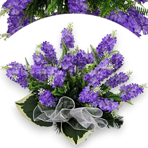 Kompozycje nagrobne z wysokiej jakości sztucznych kwiatów i roślin.
