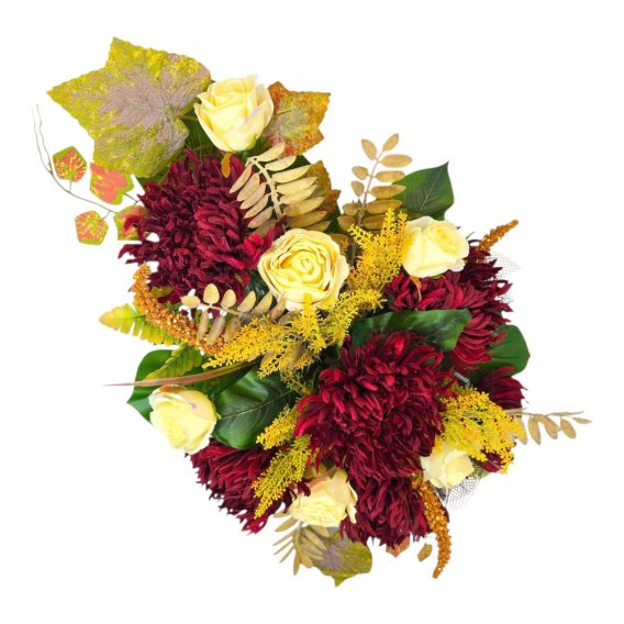 • Realistyczne i naturalne kwiaty: Nasz stroik zawiera unikalną kompozycję kwiatów, które wyglądają naturalnie i realistycznie, dodając autentyczności oraz elegancji.