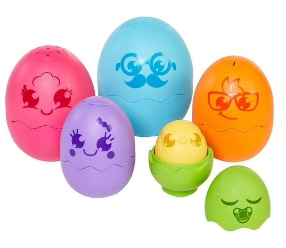 Dzieciom spodoba się sposób, w jaki gnieżdżą się razem górna i dolna połowa jaj. Każda zabawka w kształcie jajka ma inny rozmiar, kolor i wyraźną radosną buzię, która opowiada własną historię. Zagnieźdź podstawy, a następnie dopasuj i ułóż skorupki po kolei, tworząc jedno gotowe jajko, w którym wszystkie inne są ukryte. Dopasuj wszystkie elementy, aby uzyskać pięć jajek oraz małego piszczącego kurczaka. Używanie skorupek jako kubków do nalewania daje mnóstwo radości. Zaprojektowany z myślą o małych rączkach, ten kolorowy zestaw z jajkami stymuluje naukę rozpoznawania kolorów i poprawia zdolności motoryczne