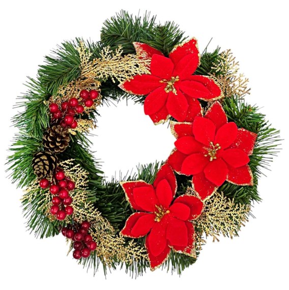 - ✅Materiał: sztuczne rośliny (gwiazda betlejemska, jarzębina, złote gałązki, iglasty wianek PCV)
