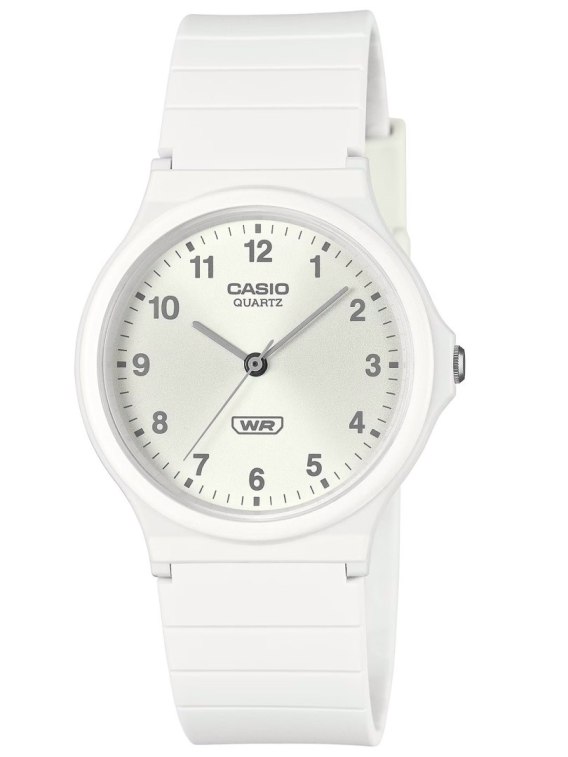 Zegarek damski CASIO MQ-24B-7BD to prawdziwe ucieleśnienie prostoty i lekkości. Ten model zachwyca swoją minimalistyczną formą, która doskonale wpisuje się w codzienne stylizacje, dodając im odrobiny sportowego wdzięku. Jego okrągła, wytrzymała koperta z tworzywa sztucznego w białym odcieniu prezentuje się niezwykle oryginalnie, a jednocześnie pozostaje uniwersalna, pasując do różnych stylów - od casualowych po bardziej sportowe. Tarcza zegarka, utrzymana w srebrnej kolorystyce, została ozdobiona delikatnymi, indeksami w szarym kolorze oraz smukłymi wskazówkami, które zapewniają doskonałą czytelność czasu. Brak zbędnych ozdób sprawia, że zegarek wygląda nie tylko stylowo, ale także niezwykle świeżo i nowocześnie.
